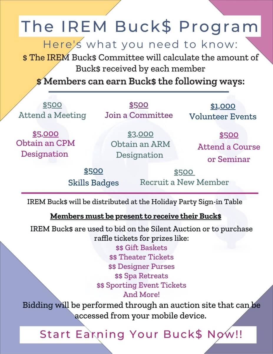 BUCK$ earned are redeemed at the end of the year at our Annual Holiday Party to bid on our silent auction items. In past years, prizes at the silent auction ranged from Coach Handbags to Raven Tickets. For more information about IREM Bucks, please contact the Committee Chair, Jenn Coco, jcoco@westminsterhouseapts.org.